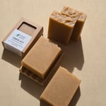 Ingredients: Olive Oil, Coconut Oil, Distilled Water, Palm Oil, Sodium Hydroxide, Safflower Oil, Castor Oil, Shea Butter, Oat Milk, Coconut Milk, Organic Oats, Turmeric Powder, Kaolin Clay, Calendula Flowers, Chamomile Flowers, Moringa Leaves, Nettle Leaves.